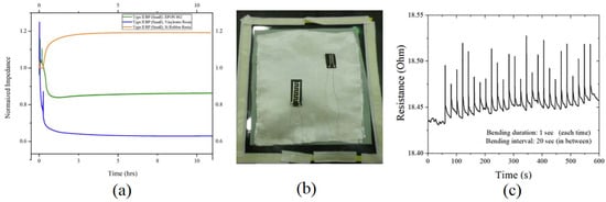 (a) Normalized impedance over time for vacuum and curing cycles for three types of resin; (b) Printed strain sensor placed on glass fiber reinforced composite; (c) Results of impact hammer bending of glass fiber reinforced composite with embedded printed strain sensor. (Reprinted from [] under CC BY-NC-ND 4.0 license).