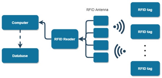 RFID aims at replacing the identification methods of goods with smart labels [,]. As the name suggests, RFID is used to transfer the identification information wirelessly via RF transmissions. As schematized in Figure 6, a typical RFID system consists of three parts: a reader (transponder), tag (smart label) categorized as active or passive, and a computer that collects and manages the information []. In numerous RFID applications, the computer manages a database of the supported tag identifiers, and it has the implementation of the application. The transponder is responsible for accessing the tags and supplying them the required energy. In passive RFID tags, no power supply units are integrated into the circuits []. Instead, these tags draw power wirelessly through induction from the device that is reading them. Active tags, on the other hand, have an onboard power supply. However, passive tags are more common than active tags due to their lower cost and compact size [].