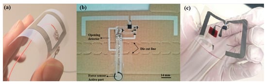 (a) A printed RFID coil by the authors; (b) a fabricated RFID tag with an opening sensor and force sensor as a part of the packaging []; (c) an RFID tag with light detection capabilities printed on a flexible PEN substrate [].