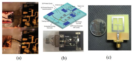 (a) Printed interconnect (above) and a ribbon-bond interconnect (below) (Reprinted with permission from []. Copyright 2020 IEEE); (b) the structure for the embedded-on-package 5G energy harvester (above) and printed device (below) (Reprinted with permission from []. Copyright 2019 IEEE); (c) Printed antenna for WLAN and 5G applications (Reprinted with permission from []. Copyright 2020 IEEE).