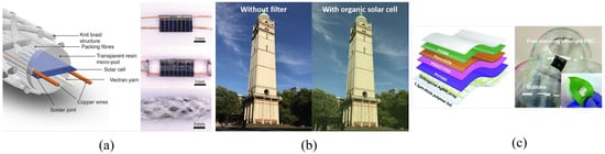 (a) Solar cell embedded into yarns (Reprinted from [] under CC BY 4.0 license); (b) Transparent organic solar cell (Reprinted with permission from []. Copyright 2020 American Chemical Society); (c) Flexible perovskite solar cell (Reprinted with permission []. Copyright 2019 Royal Society of Chemistry).