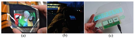 (a) A flexible color display (Reprinted with permission from []. Copyright 2018 IEEE); (b) a screen printed electroluminescent matrix display integrated into a back pack; (c) a closer look of the screen printed electroluminescent matrix display with the controlling module (Reprinted with permission from []. Copyright 2018 IEEE).