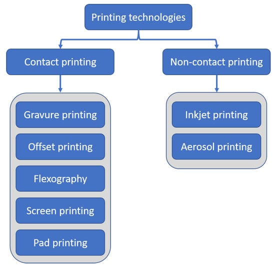 The technologies used for printing electronic components are well-known in the graphic arts. Some examples are gravure printing, flexography, offset printing, screen printing and inkjet printing as depicted in Figure 11. These technologies are often grouped into contact printing processes, which use printing master [], contactless (non impact) printing processes that do not need a master [], and hybrid printing processes combining different printing and deposition techniques. In a nutshell, all these processes are used to deposit stacked layer structures, such as electrodes, conductive layers, isolating layers for electronic components []. After deposition, the ink subsequently changes its phase in the desired site [,,,]. The initial state, flow and phase change of the ink on the substrate are mainly affected by the viscosity, density, surface tension, solvent evaporation rate, solubility and curing characteristics of the ink, and wettability and permeability of the substrate in use [,]. Moreover, multi-layer and multi-material nature of the final device require compatibility and hence treatment of each layer to ensure the desired function, e.g., minimal sheet resistance within a short-time span and without damaging previously deposited layers. As exemplified in the previous section, typical printed devices include sensors, batteries, capacitors, transistors, solar cells, memories, electroluminescent structures, large screens, and light panels [,,,,,,,,,,].