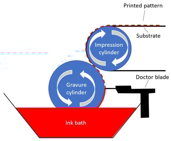 In gravure printing, the elements of the image are engraved on the surface of the printing cylinder, while the non-image areas remain at the original level. As visualized in Figure 12, the engraved printing cylinder rotates in an ink fountain partially filled with ink. The entire surface of the cylinder collects ink from the fountain and the excess ink is wiped off the non-image areas with a doctor blade leaving the ink in the engraved cells. The ink is then transferred from the cells directly to the substrate in a printing nip under pressure. Ink transfer is often improved by using an electrostatic assistance system (ESA) that creates an electric field across the nip. The electric field assist in lifting the ink from the cells onto the substrate. The ink layer is dried by evaporating the ink solvent with hot air [,].