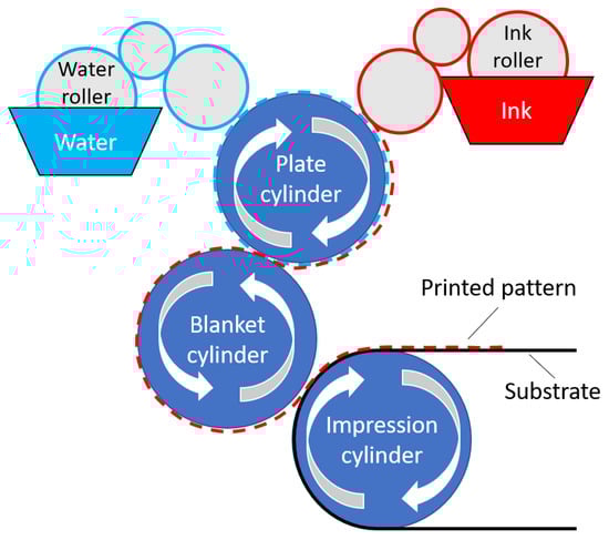 Offset printing is an indirect printing method, in which the ink is transferred from a printing plate to the substrate with an intermediate blanket cylinder, as schematized in Figure 13. Damping rollers apply a thin layer of moisturizing water to the hydrophilic non-image areas of the plate. After that ink rollers transfer a thin film of ink over the oleophilic image areas. The image and other areas are at the same level, but their surface energies are different. The surface chemistry has an important role in offset printing; image areas accept ink but repel water and non-image areas accept water but repel ink. This difference in surface energy prevents ink from spreading from the image areas, and a thin layer of wetting water in non-image areas prevents further spreading. The ink layer is then transferred to the blanket cylinder and then to the paper in the nip under pressure. Offset printing is a wet-on-wet printing method in which process inks are printed sequentially without intermediate drying. Therefore, some ink is also transferred to the blanket cylinder of the next print unit. After the last printing, the ink layer is dried by absorption, polymerization, oxidation, or evaporation [].