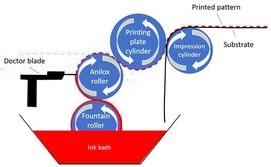 Flexography is used, e.g., for printing RFID antennas, batteries, organic electronic circuits such as OLEDs and solar cells. OLEDs are used to make diode displays (televisions, computer monitors) and lighting (diode lamps). Smart labels and thin films printed on polyester film can be used, for example, to monitor temperature during drug transport [,]. The resolution is typically 60 lines/cm and the print speed is 3 to 12 m/s. The biggest challenge is maintaining color saturation and density in fixed areas. Flexography is suitable for a wide range of printing media. For example, non-porous and porous substrates can be printed without problems.