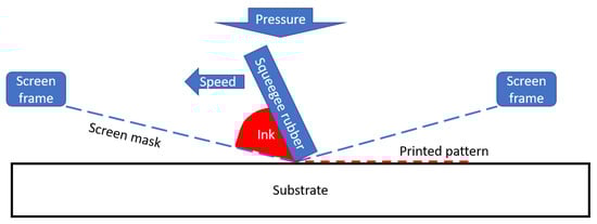 Screen printing is a so-called push-through process, in which ink is pushed through a fine fabric (screen) made of plastic or metal fiber or wire. The non-image areas of the screen are covered with a stencil that defines the printed image and acts as a printing plate. As shown in Figure 15, the screen is full of ink that is pushed through the image areas of the screen using a squeegee. The achievable print thickness is greater than it is in other printing methods. Drying of the ink layer is typically accomplished by evaporation, oxidation, or ultraviolet (UV) curing. Drying can be accelerated by blowing warm air onto its surface []. Print quality is determined by the material, fineness and thickness of the screen, the distance between the top and bottom of the screen, and the open area of the screen. The fineness of the screen is typically 90 to 120 fibers/cm.