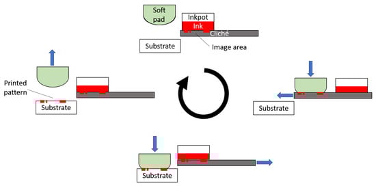 Pad printing is a printing process that can be used to transfer a planar image to a 3D object as shown in Figure 16. This is accomplished using an indirect offset printing technique in which an image is transferred from a cliché through a silicone pad to a substrate. This process has been used as an alternative to screen printing, e.g., for printing transistor electrodes [].