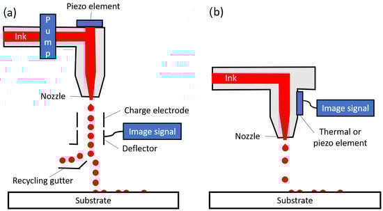 Inkjet technologies can be divided into continuous-stream (CS) and drop-on-demand (DOD) inkjet. These techniques are further subdivided into sub-technologies that differ in droplet formation or control mechanisms []. CS is mainly used in high-speed and high-volume printing applications such as direct marking, bar coding, personalization, labeling, catalogs, hybrid printing, packaging and direct mail. Typically, there are no speed limits, but print quality depends on droplet size and distance, nozzle diameter, droplet stream quality and continuity, and ink surface tension and viscosity. New developments have increased the resolution of the continuous inkjet printer to 600 dpi. A continuous inkjet generates a continuous stream of ink droplets, but only some of them are printed on the substrate. The ink droplets are charged according to the digital page information, and the charged unprinted droplets are then directed to the gutter and collected to the ink chamber. The ink drop is recycled about 40 times before printing []. The schematics for CS inkjet printing are displayed in Figure 17a. On the other hand, the high-resolution DOD inkjet is primarily used for small-scale home and office printing, desktop publishing, and high-quality wide-format printing and color coating. However, the print speed is slow. The maximum resolution (2880 dpi) is up to five times higher than CS inkjet, and the droplet size is also significantly smaller. In the DOD inkjet, every drop of ink hits the paper, and no charging, deflection or recycling systems are required. The most common DOD inkjet technologies are thermal and piezoelectric inkjets, which differ in formation technology. Figure 17b shows the schematic of DOD inkjet printing.