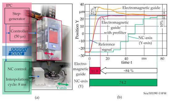 Figure 2b shows the positioning response for reference steps of 50 µm. Since there is no trajectory planning for the electromagnetic guide, the step response shows a peak overshoot of 11 µm or 22%. This can be completely avoided by using a prefilter that approximates the inverse behaviour of the closed control loop and generates a suitable setpoint sequence. Given a ±5% error band, the electromagnetic guide with prefilter shows a settling time of 11.9 ms. The step response of the Y-axis has already been corrected by the readout delay in this plot. In comparison to the guide, it shows a settling time of 76 ms, which is more than six times longer. This obviously has two reasons. On the one hand, the ascent is less steep. This means that the axis does not reach the same average speed due to restrictions in acceleration and jerk. On the other hand, there is a significant delay of more than 20 ms before the position signal follows the input signal at all. This delay results from the communication between IPC and NC control and from signal processing and interpolation inside the NC control.