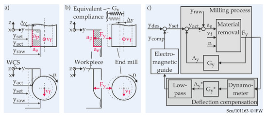 In the flank-milling process depicted in Figure 3a, the relative displacement Δy between tool and workpiece in the y-direction of the workpiece coordinate system (WCS) directly affects the shape accuracy of the generated contour. This displacement Δy depends solely on the feed normal force Fy and the total compliance of all components within the flux of force. A single substitute compliance Gy represents the relationship between force and displacement of the milling tool in Figure 3b. This allows the milling process to be modelled in a simplified way, as shown in Figure 3c. The inner feedback loop includes a representation of the material removal and the compliance Gy. Assuming a constant feed rate vf and spindle speed n, the feed normal force Fy only depends on the actual width of cut ae. The width of cut is the difference between the raw workpiece contour yraw and the actual contour point at yact that is generated at the given moment. In contrast to the depiction in Figure 3, the raw workpiece contour changes dynamically along the tool path. The trajectory yset is set by the NC control and tracked by the NC axes. At the summation point, yset is superimposed with the displacement Δy, and the actual contour yact is obtained.