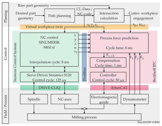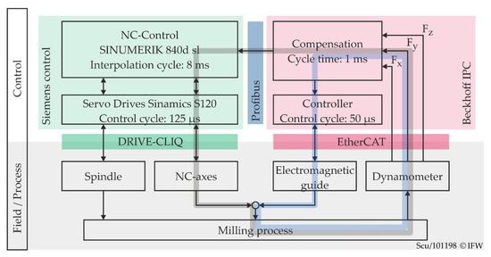 The implementation of the reactive deflection compensation within the control system of the machine tool is demonstrated in Figure 4. It is divided horizontally into a control layer and a field or process and shows the information flow between the components of the control system and the hardware. Furthermore, basic information about the communication paths and cycle times is given.