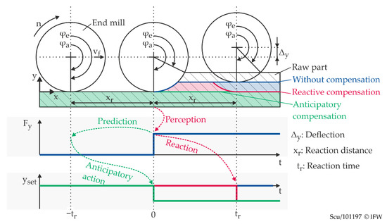 The reactive compensation described in the previous section is subject to delays because of signal and bus runtimes as well as processing cycles. This means that the system cannot react to process force variations before a reaction time tr has elapsed. The effect is shown in simplified form in Figure 5 (red curves and arrows) without considering any positioning dynamics. In this scenario, the milling tool moves from an area where it barely touches the surface to an area with a substantial width of cut. The transition occurs at the time t = 0, as depicted in the upper graph in Figure 5. The radius in the transition area of the prepared workpiece blank exactly equals the tool radius. This, in theory, leads to an abrupt increase of the cutting force since the entry angle φe of the cutting edge and, therefore, the average chip cross-section, show a step change. The resulting deflection of the tool is not compensated until the machine tool carries out the corrective movement at t = tr. The surface generated in the meantime consequently deviates from the desired contour.