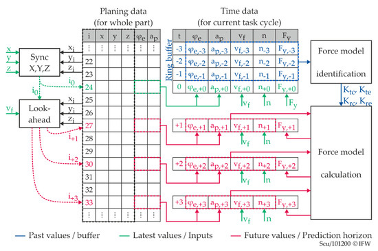 At the end of each force prediction cycle, the most recent time data, including the measured process forces, are moved into a ring buffer (Figure 7). These data are used to calculate and update the process force coefficients K for the Altintas model. Since the force coefficients are determined continuously during machining, no extra experiments need to be carried out in advance.