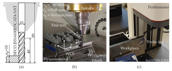 The compensation approaches were investigated in flank milling of straight contours with a varying width of cut. A carbide end mill from SECO with a diameter of 10 mm and 4 flutes was used (Figure 8a). The workpiece was a 10 mm thick piece of cold-rolled steel (C45). During machining, it was clamped directly onto the dynamometer (Kistler 9257B), as seen in Figure 8b.