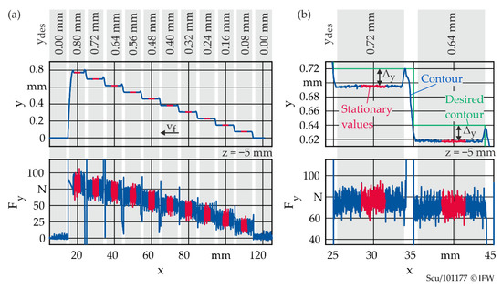 Figure 9a shows the actual contour y, measured in the centre of the machined surface at z = −5 mm, and the corresponding normal feed force. Both are plotted over the tool position in WCS x-direction. The feed direction was in the negative x-direction. The desired contour ydes is given above the plots for each area. The effective displacement Δy can now be calculated for each area as the difference between the measured contour y and the desired contour ydes. This is shown for two steps on a larger scale in Figure 9b. The measured values marked in red are approximately in the middle of the single steps. Here, the transient processes are over, and stationary behaviour can be assumed. These values are averaged and used to calculate static equivalent compliance for each step i with