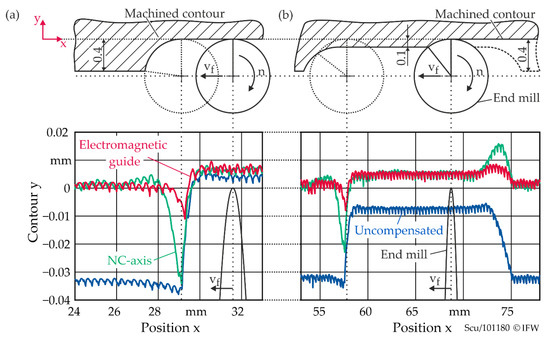 Figure 10b also shows an undersize at the transition to the lower width of the cut since the compensation movement is not retracted quickly enough. The error is 16 µm for the NC axis and 9 µm for the electromagnetic guide. Due to this overcompensation, the peak-to-peak contour error for compensation using the NC axis is even worse than machining without any compensation.