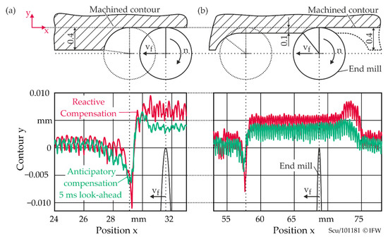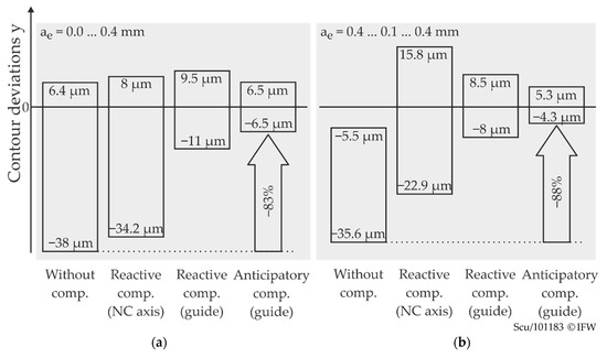 Figure 11 compares the reactive compensation by means of the electromagnetic guide with the anticipatory approach. For this purpose, a constant lookahead of 5 ms was used, which was determined iteratively. All parameters correspond to the previous investigations. In the transition from ae = 0 mm to 0.4 mm (Figure 11a), the anticipatory approach reduces the maximum contour error from 11 µm to 6.5 µm compared to the reactive approach. In relation to the reference test without compensation, the maximum error is thus reduced by 83%. At the transition from ae = 0.1 mm to 0.4 mm (Figure 11b), the contour deviation is again significantly reduced. The maximum remaining oversize of 4.3 µm is only approximately 12% of the uncompensated error. The overcompensation at the transition to the smaller width of the cut is significantly reduced. Compared to the 8.5 µm with reactive compensation, it is now only 5.3 µm.