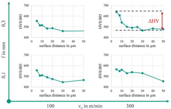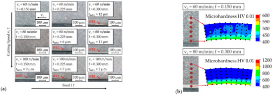 surf = 5 µm under the surface reaches more than 900 HV0.01, which clearly indicates an austenitic–martensitic phase transformation. The probability of white layer formation within the given parameter field increases with both the cutting velocity and the feed. Regarding the white layer thickness, the values vary between t