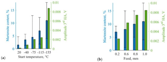 Figure 3 illustrates that the phase transformation was promoted by a low machining temperature (a) as well as by a high feed rate (b). Cryogenic precooling of the workpiece is required to promote the martensitic transformation, which lowers the stacking fault energy of the alloy [