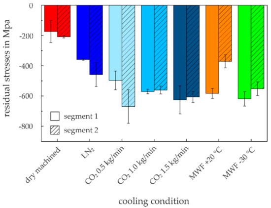 Figure 5. Herein, Segments 1 and 2 indicate specimen segments measured at different axial positions. Compared to dry cutting, using cooling media generally leads to more compressive residual stresses. A systematic difference between Segments 1 and 2 cannot be observed. While LN2 cooling provided the lowest tool temperatures, residual stresses resulting from LN2 machining are the highest of the compared cooling concepts.