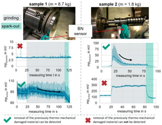 Figure 7 compares signals resulting from active and passive measurements for different process conditions. It is argued that the lighter workpiece (sample 2) is prone to mechanical excitation by the grinding wheel. In this case the passive signal is significant, while the active one is saturated and thus insignificant. When grinding sample 1, the active signal is significant, while the passive one is not. Thus, the selective application of active and passive Barkhausen noise can help to identify surface characteristics under different machining conditions. Nevertheless, it remains challenging to reliably identify different levels of thermal workpiece damage, e.g., shift of residual stresses, light tempering, strong tempering and rehardening, due to the multiple mechanical and microstructural parameters, influencing the Barkhausen noise [