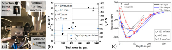 Figure 9a, structure-borne sensors and airborne sensors are mounted in the machine to measure the AE and to identify the segmentation frequency of the titanium chips. These chips present a saw-tooth shape due to periodic strain localization caused by the prevalence of thermal softening over strain hardening. Abrasive tool wear leads to an increase in the cutting-edge radius resulting, as expected, into a considerably increase of the passive forces, as shown in