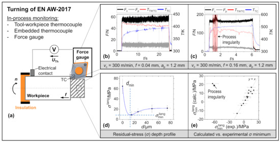 Figure 10e, these predictions are compared to experimental values. Since the process anomaly impacts the surface-layer state significantly, the model equations are not valid for processes with irregularities. This emphasizes the need for detecting process irregularities. Further steps consist of extending the investigations to processes with cooling lubricant, worn tools and machining of the alloy EN AW-7075.