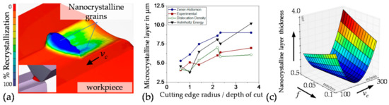Figure 11c shows subsurface grain refinement caused by the mechanical and thermal load combination obtained with different cutting speed and feed parameters. The disadvantage of FE simulations consists of long run times, which impede the direct use of FE models in machining controls. Hence, the generated data is to be condensed into machine learning models such as, decision trees or analytical equations which take the process parameters and characteristics as input and deliver the nanocrystalline surface thickness. The data reduction of the specimen microstructure to a scalar value is motivated by previous works [
