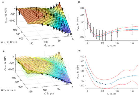 Figure 12d for larger depths. However, when considering the physical mechanisms and empirical knowledge it is clear that residual stress profiles uncertainty at larger depths are definitely close to zero. This shows the deficits of data-driven approaches which are not complemented by mechanism knowledge. For the Takagi–Sugeno model, a bounded error parameter estimation was used. Depending on the error bounds, which can be chosen individually for each data point, feasible model parameter sets result. In bounded error estimation, no statistical assumptions are made about the error distribution. In GPR models, on the other hand, a normal distribution assumption is made, which is often not fulfilled in reality. Regarding the mean prediction and the measured values, both approaches are well suited for modeling residual stress profiles.
