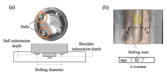 In order to induce compressive residual stresses and improve fatigue life of joints, two different cold working processes of the in situ/sequential rolling process as well as the LBP technique were carried out on the friction stir welded samples. The in situ/sequential technique was performed on joint samples by means of a custom-made tool with four balls. Two sets of balls with diameters of 6 and 8 mm were taken to further study the effects of ball diameter on fatigue performance. The ball indentation value was selected in such a way that the shoulder penetration maintained its constant depth of 1 mm during the operation through changing gaskets from 0.05 to 0.7 mm. An optimum value for the rolling diameter was found to be equal to 34 mm. While the sequential technique rolled the top surface of friction stir welded joints after the completion of welding process, the in situ rolling process was carried out simultaneously with the FSW operation. The in situ/sequential rolling operation on FSW joints was discussed in detail in Ref. [27]. The rolling tool shape and geometry as well as the rolled joint are presented in Figure 1.