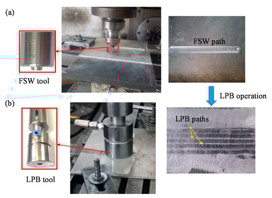 (a) The LPB tool and set up; (b) burnished paths on the Al 7075-T6 welded joint.