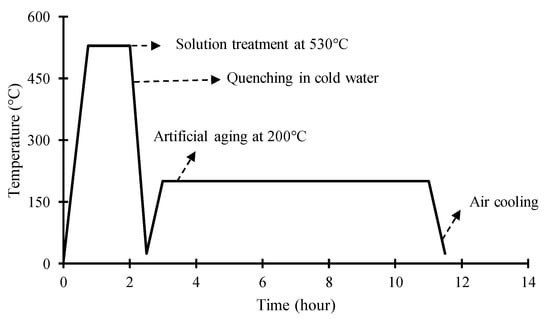Al 6001-T6 FSW joints were solution heat-treated to examine the fatigue response of joints before and after STA post-processing. The solution heat-treating stage was followed by artificial aging. Figure 3 schematically presents the sequence of the heat-treatment of aluminum joints over the length of the aging time.
