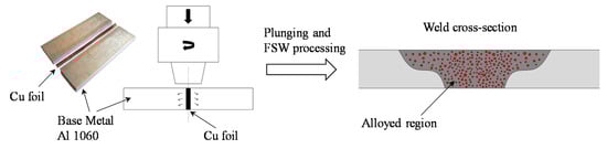 The effects of inserted thin copper foils with thicknesses of 100 and 200 μm between the faying surfaces of joint sheets were studied to assess fatigue response of Al 1060-H16 FSW joints. The operation of the FSW process in the presence of a thin copper foil between the faying surfaces of sheet joints constructed a localized alloy in the weld central region, affecting the static and fatigue strengths of aluminum joints. Schematic views of the alloying process as well as the joint samples are shown in Figure 4.