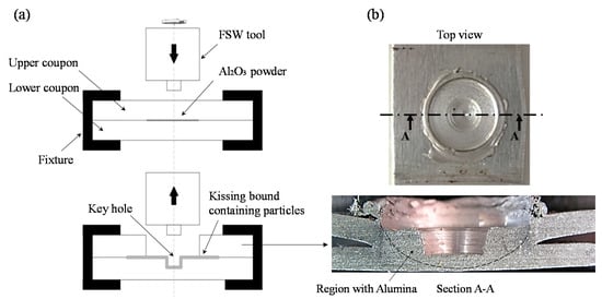 (a) The process of creating MMC through adding alumina powder in the weld nugget of FSSW joints; (b) a typical FSSW joint sample with the A–A cross-sectional view.
