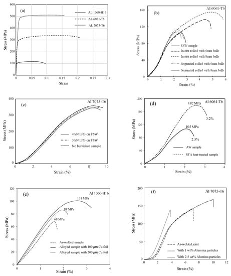 Tensile stress–strain curves for Al 10160-H16, Al 6061-T6 and Al 7075-T6 examined in this study: (a) base-metal; (b) in situ vs. sequentially rolled joints; (c) LPB vs. non-burnished joints; (d) heat-treated vs. non-heat-treated joints; (e) joints with Cu foil vs. without Cu foil; (f) joints with alumina and without alumina powder.