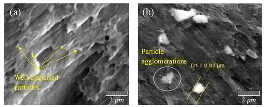 SEM images of distribution of alumina powder in aluminum 7075-T6 after FSSW procedure in: (a) the joint containing 1 wt.% alumina particles; (b) the joint with 2.5 wt.% alumina particles.