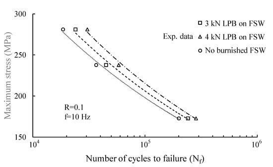 The low-plasticity burnishing process of friction stir welded joints improved the fatigue lives of aluminum joints by as high as 28% and 57%, respectively, under vertical forces of 3 and 4 kN as compared with those of unburnished joints, as presented in Figure 12.