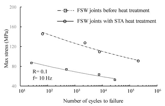 Stress–fatigue life data of heat-treated FSW samples and their comparison with those of as-welded joints.