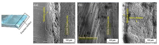 SEM images of fracture surface: (a) as-welded Al 1060-H16 FSW sample; (b) FSW sample with 100 μm-thick copper foil in the SZ; (c) FSW sample with 200 μm-thick copper foil in the SZ.