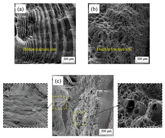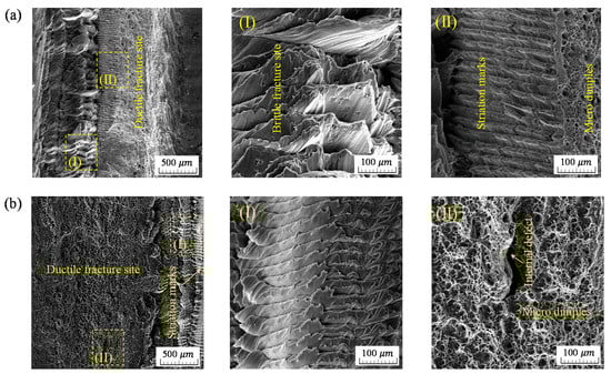 The STA heat treatment altered the features of the fracture surface on joints that failed, as evidenced in Figure 17. Ductile fracture mode and related dimples on the fracture surface of joints post-processed with STA heat-treatment were found to be larger than those of as-welded joints. Heat-treatment of joints uniformly distributed precipitates throughout weld regions. This resulted in a greater fatigue performance. The evidence of second-phase particles Mg2Si over the aging process was detailed in references [31,32]. Fracture surfaces within a ductile mode consisted of dimples, while those with a brittle mode show striation marks on the welded joints in this figure.