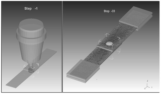 A 3D numerical analysis was performed using a commercial finite element software (i.e., DEFORM®) to both further investigate the behaviour of the tested joints and set a predictive tool for the design of riveted joints. Two different numerical models were analysed for each joint configuration: the first simulates the orbital forming process with a rigid punch lowering speed of 4 mm/min and a rotation speed of 1500 rpm, and the second models the single-lap shear test (see Figure 4).
