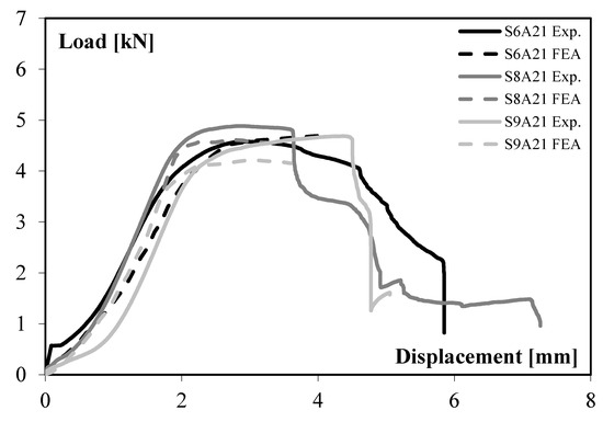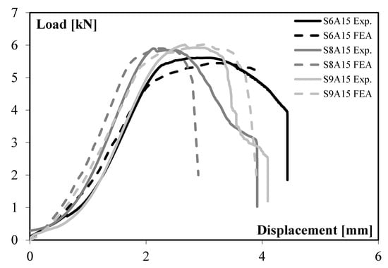 Figure 5 and Figure 6 also show the comparison between the numerical and experimental load/displacement curves. It is obvious that the numerical trend agrees well with the experimental one. The numerical curves are interrupted at the step where one of the two critical values of damage was overcome, except for S8A15 and S9A15, where unbuttoning led to a rapid decay of the load.