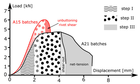 - In the initial region, at low displacement, two sub-steps can be seen. First, mechanical adjustments (i.e., backlash and axis deviation) occur. These have no effect on the mechanical behaviour of the joint and are not considered in the performance evaluation of the riveted joints. Then, in the second sub-step, a progressive and linear increase in load with increasing displacement is observed. The strength of the joint depends on the shear strength of the rivet. The slope, which is indirectly related to the stiffness of the joint, is similar for all specimens of this configuration.