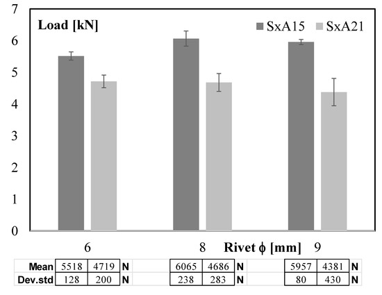 In Figure 8, the maximum values are given and compared. In particular, the joints of the SxA15 series are characterised by a higher resistance than those of the SxA21 series.