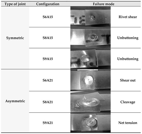 To better correlate the strength of the joint with the fracture mechanism that occurred, Figure 9 shows the photographs of the observed failure modes. For sample S6A15, the head of the rivet breaks drastically at its low resistance. At higher diameters, the unbuttoning occurs. In fact, in these joints, thanks to the resistance offered by the cross section of the sheets, shear out or net tension failure modes are avoided. At higher loads, the aluminium sheets lose contact within the overlapping surface. Then, the rivet is the only element that contributes to the resistance with its shear behaviour. The area around the rivet undergoes greater deformations until the rivet pull-out occurs [24].