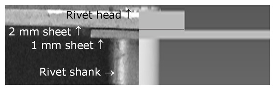 The difference in the geometry of the rivet is minimal. For the symmetrical joints, the final diameter of the riveted shank ranges between −0.4% for the sample S8A15 and 1.0% for sample S6A15. For the asymmetric joints, it ranges between −3.2% for sample S6A21 and 0.9% for sample S8A21. The final height of the rivets is between 1.9 and 3%.
