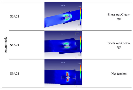 - Asymmetrical joint S8A21: a very similar distribution to the previous one is observed, high damage values are localised between the hole and the edge of the sheet; this distribution leads simultaneously to shear out and net tension of aluminium, i.e., cleavage failure mode.