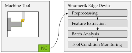 In this section, the proposed method for batch-aware tool condition monitoring is described (see Figure 1). High-frequency control data are acquired from the machine tool’s numerical control (NC) by a connected edge device. On the edge device, data preprocessing is carried out to reduce the signal impact of cutting conditions. Subsequently, feature extraction is used to aggregate the high-dimensional and high-frequency data into low-dimensional feature vectors. These feature vectors are used for batch analysis, consisting of the identification of clusters of material batches with similar machinability. The influence of the material batch on the signals can hence be considered for the subsequent tool condition monitoring.