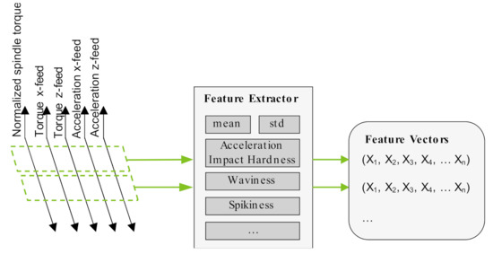 As the spindle torque and the position signals are only needed for preprocessing, they are not used further for feature extraction. Thus, only the torque of the x- and z-feed drives, the computed normalized spindle torque, and the acceleration signals for the x- and z-feed drives are analyzed.